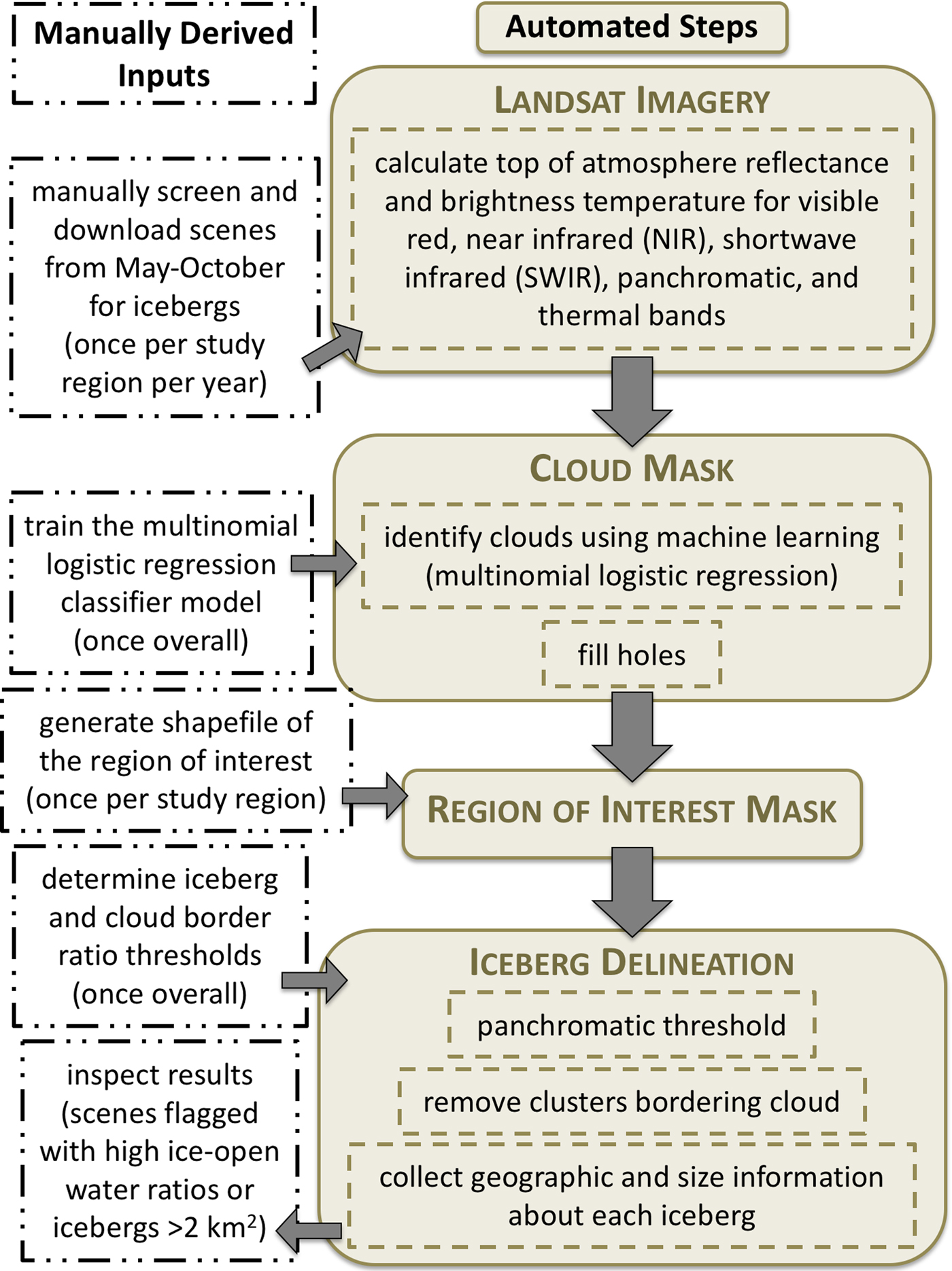 Fig. 2. Schematic illustration of the steps of the final semi-automated iceberg delineation algorithm.