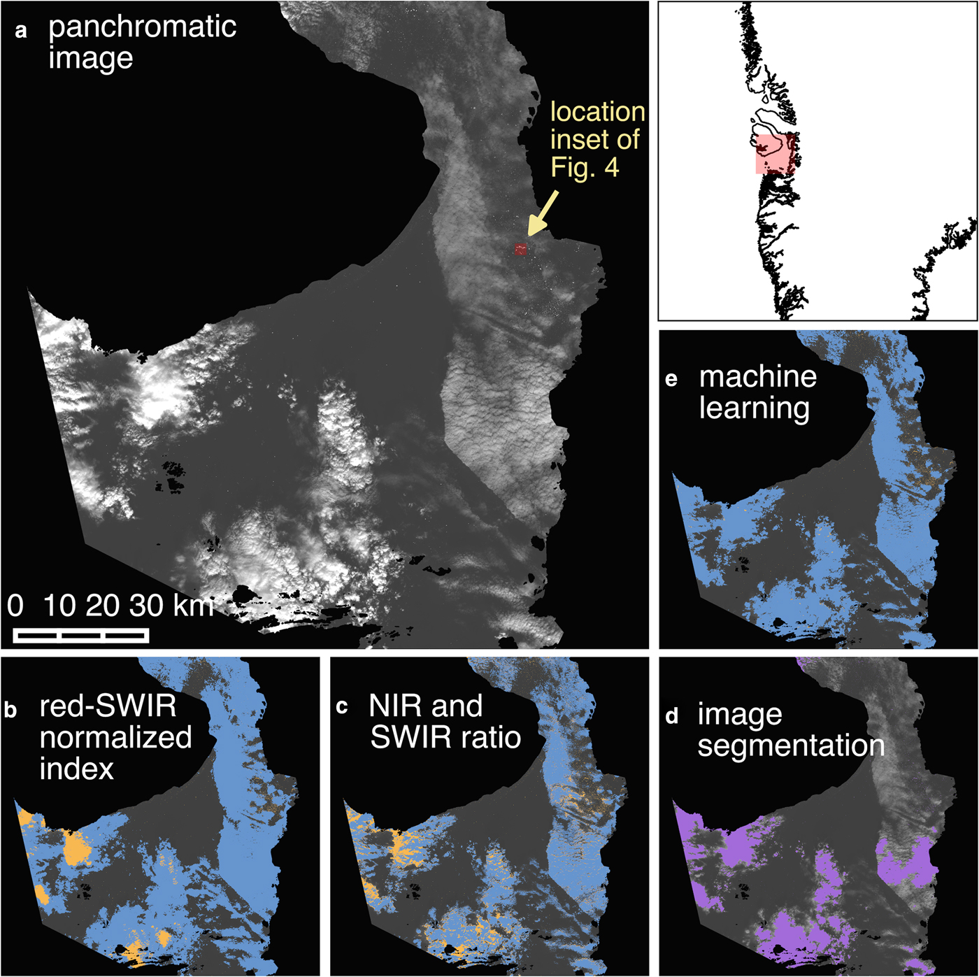 Fig. 3. Comparison of multiple cloud masking and iceberg delineation techniques. (a) Panchromatic (Landsat 8 band 8) scene of Disko Bay from 31 August 2013 showing multiple cloud types. (b–c) Cloud mask (blue) generated using red–SWIR normalized index thresholding and NIR:SWIR ratio combined with SWIR reflectance band thresholding, respectively. Everything above the iceberg delineation threshold after cloud masking is shown in orange. (d) Icebergs and clouds are detected simultaneously using image segmentation (purple). (e) As in (b–c) for the machine learning-based cloud mask.