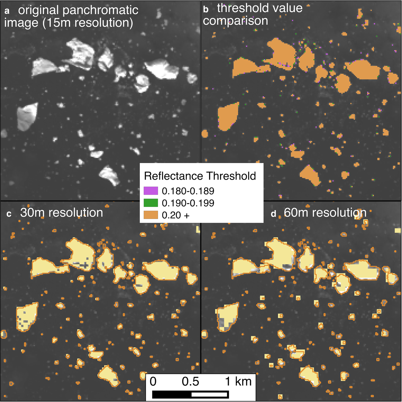 Fig. 4. Influence of threshold choice and image resolution on algorithm performance. Location of panels is shown on Fig. 3. (a) Original panchromatic (Landsat 8 band 8) scene from 31 August 2013. (b) The results of threshold sensitivity tests. Pixels identified as ice by the optimal threshold (0.19) are colored orange and green. (c–d) Automated iceberg masks constructed with the optimal threshold (in yellow), but for 30 m resolution (c) and 60 m resolution (d) images. Orange lines in (c–d) show iceberg outlines derived from the 15 m resolution image.