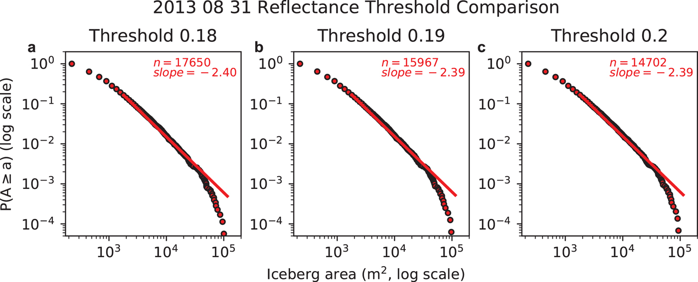 Satellite image-derived iceberg size distributions are fairly insensitive to the choice of the reflectance threshold used to identify icebergs in the cloud-masked scenes, provided the threshold value is tailored to the study site (Figs 4, 5). Specifically, modification of the reflectance threshold by ~5% (~10%) to 0.18 and 0.20 (0.17 and 0.21) resulted in changes in the slope of the power law fits of <0.4% (<0.9%). Even large changes in threshold values (e.g. ~50%) resulted in comparatively small (<9%) changes in the fitted power law slope, although the uncertainties in ice coverage and number of icebergs (>50–100%) were close to the proportional changes in threshold. Manual inspection of the results from these large threshold variations shows the lower threshold resulted in an increase in the number of false negatives and the higher threshold resulted in an increase in the number of false positives from other noise in the image. Regardless, the small changes in slope even with large changes in the threshold value suggest that the fitted power law slope remains a robust metric to describe the size distribution.
