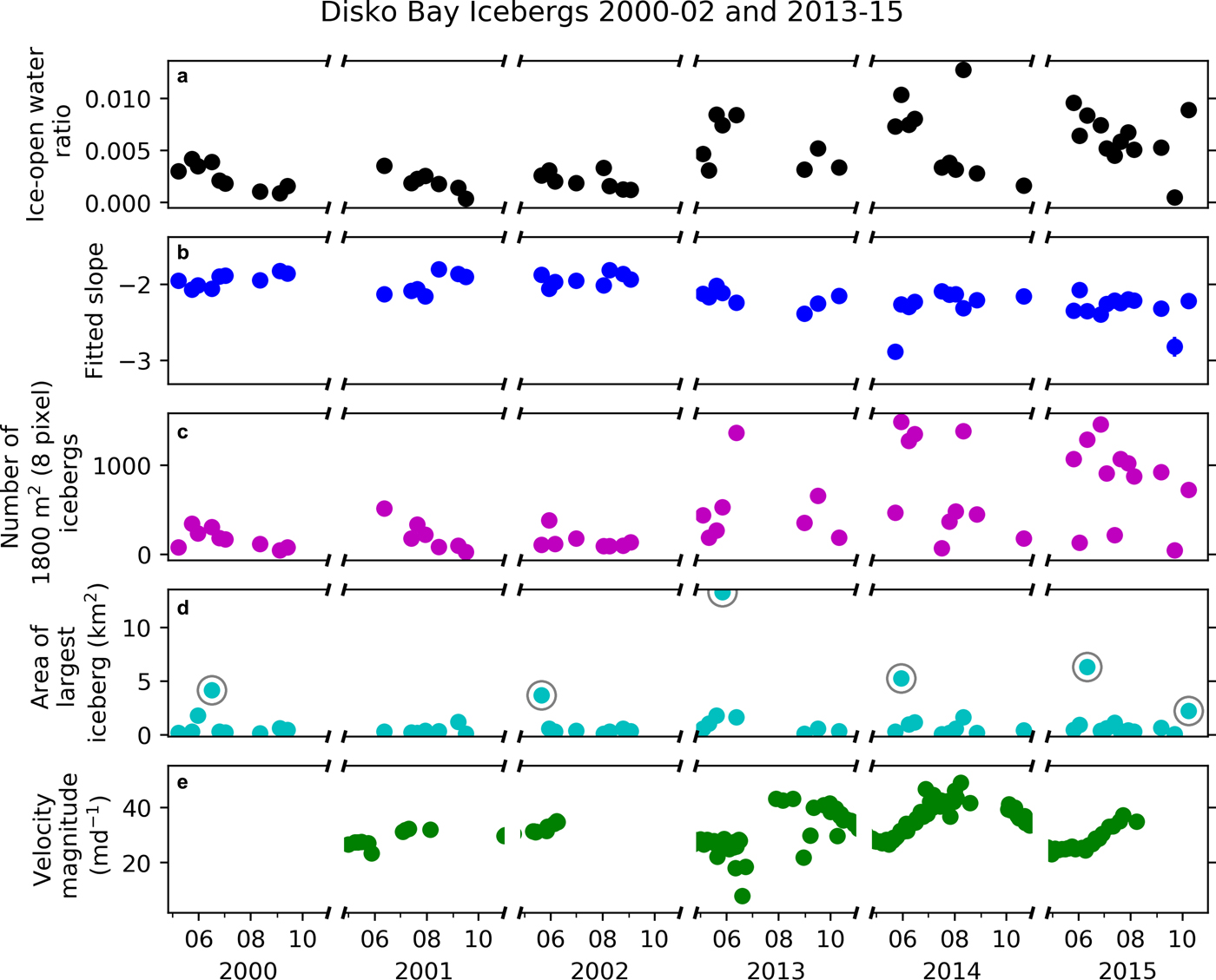 Fig. 6. Iceberg data extracted from Landsat scenes spanning 2000–02 and 2013–15. (a) Ice–open water ratio. (b) The slope of the power law curve fit to the iceberg size distribution for each scene. Error bars showing the goodness of fit of the slope to the distribution are obscured by the symbol in almost all cases. (c) Number of eight pixel (1800 m2) icebergs. (d) Plan view area of the largest iceberg. Circled points are sea ice > 2 km2 detected in scenes not excluded from our results as discussed in the text. (e) Surface velocity magnitude 1 km upstream of the terminus.