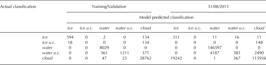 Table 1. Confusion matrices for the machine learning-based cloud mask for multiple validation sets. The first (Training/Validation) shows the results of the validation dataset from the randomly sampled datasets made up of manually classified pixels from four scenes as outlined in the text. The second (31/08/2013) was generated from a Landsat scene collected 31 August 2013 and only used to validate the model.