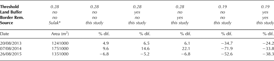 We evaluated algorithm performance by running the algorithm on several Landsat Collection scenes (20 August 2013, 7 August 2014 and 26 August 2015) covering Kangerlussuup Sermia Fjord, scenes for which Sulak and others (Reference Sulak, Sutherland, Enderlin, Stearns and Hamilton2017) previously established total iceberg areas. To match the methodology of Sulak and others (Reference Sulak, Sutherland, Enderlin, Stearns and Hamilton2017) as closely as possible, we ran the algorithm as designed as well as with a higher reflectance threshold (0.28), without the land buffer and without the step removing partial icebergs captured along the ROI and scene borders. The cloud mask was run in each case, even though Sulak and others (Reference Sulak, Sutherland, Enderlin, Stearns and Hamilton2017) manually selected the images as cloud-free. This resulted in very limited (<0.08%) cloud cover over the area of interest, illustrating that our cloud mask successfully avoids false positives.