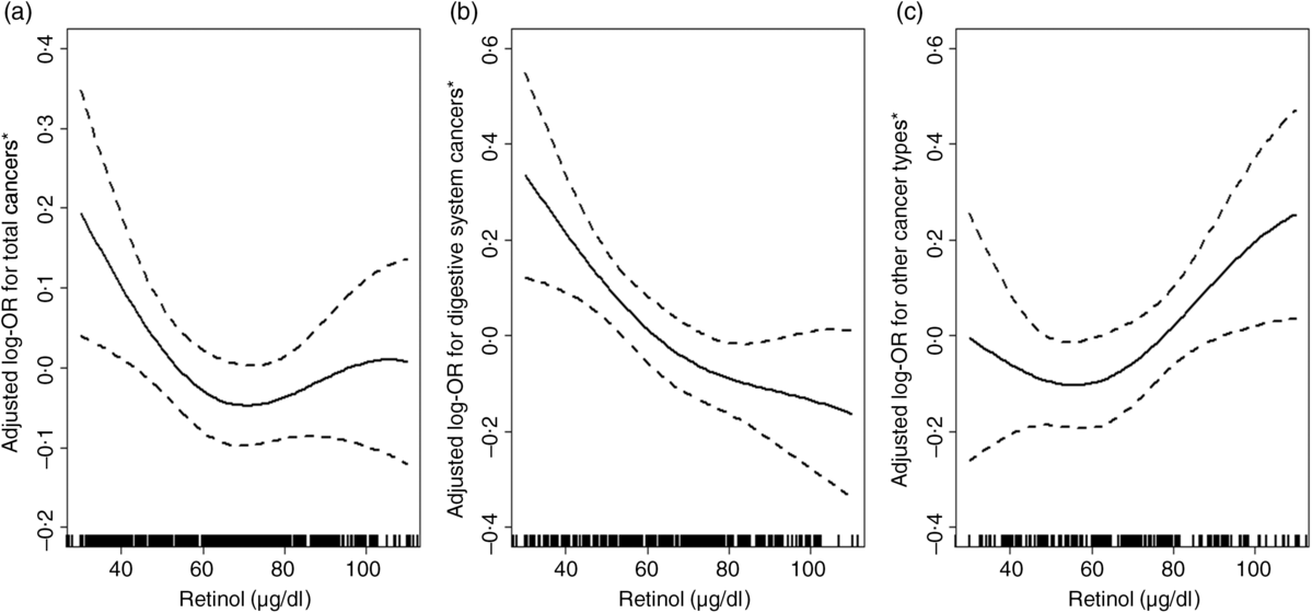 In conclusion, our study found a significant inverse dose–response association between plasma retinol levels and the risk of digestive system cancers. However, a U-shaped association was found for non-digestive cancers with plasma retinol turning point of 68·2 μg/dl.