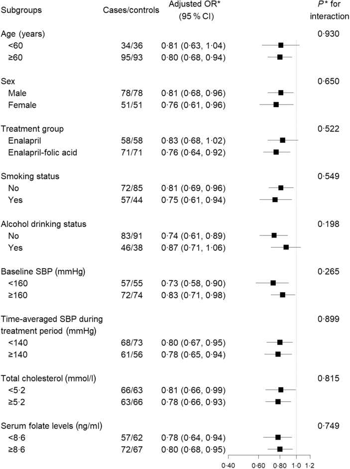* Adjusted for BMI, smoking status, alcohol drinking status, SBP, DBP, total cholesterol, TAG, HDL-cholesterol, fasting glucose, folate, total homocysteine at baseline, as well as time-averaged SBP and DBP over the trial period.