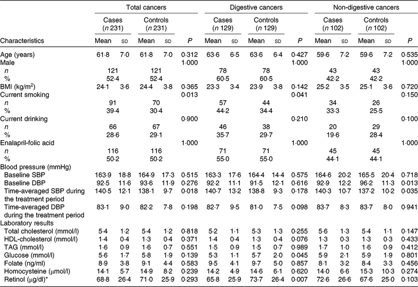 Using data from the CSPPT, we conducted a nested case–control study of 232 incident cases and 232 matched controls within this cohort. Controls were randomly chosen from the baseline CSPPT participants who did not develop cancer during the follow-up period and were matched for age (no more than 1 year), sex, treatment group and study site with the cases on a 1:1 ratio. After excluding those with missing retinol data, a total of 231 incident cases, which included 129 cases of digestive cancers (53 oesophageal, forty-three gastric, nineteen colorectal and fourteen other sites) and 102 cases of non-digestive cancers (twenty-seven breast, twenty-six lung and forty-nine other sites), and 231 matched controls were included in the present analysis (Supplementary Fig. S1).