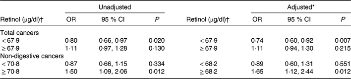 Table 1 shows the baseline characteristics of the cases and controls by total cancers, digestive cancers and non-digestive cancers. Mean values of plasma retinol were lower in patients with digestive cancers (65·8 (SD 25·9) μg/dl) than in control subjects (73·7 (SD 26·4) μg/dl); however, values did not differ significantly between cases and control subjects for total cancers and non-digestive cancers.