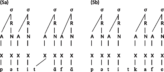 pətitãfã]). (3b) présente la structure d'un mot comme pépite dont la dernière syllabe est fermée et qui apparaît avec un /t/ devant initiale vocalique comme devant initiale consonantique. Le français connaît un processus très général d'enchaînement qui lie dynamiquement les unités lexicales les unes aux autres au sein d'unités prosodiques plus larges appelées syntagmes phonologiques. Ce processus bien connu d'enchaînement prend la forme de la resyllabation d'une consonne finale de mot sur l'initiale du mot suivant si elle est vocalique (Delattre Reference Delattre1951 ; Fouché Reference Fouché1959 ; Grammont Reference Grammont1914). Ce processus d'enchaînement est illustré en (4) où la consonne finale de pépite est resyllabée à l'initiale de ovale : son liage avec la syllabe initiale de ovale entraîne son déliage de la syllabe finale de pépite. Comme le souligne fort justement Encrevé (Reference Encrevé1988), la liaison en français n'est qu'un cas particulier de l'enchaînement, c'est-à-dire précisément de cette resyllabation des consonnes finales sur les initiales vocaliques que nous venons d'illustrer. Mais si la liaison est un cas particulier, ce qui importe alors de comprendre, d'analyser et éventuellement de formaliser, c'est précisément ce qui en fait un cas particulier. Ce ne peut être l'enchaînement puisque comme nous venons de le voir, le processus d'enchaînement est strictement identique dans un cas d'enchaînement d'une consonne finale fixe comme dans (4) et d'une consonne de liaison (CL) comme dans (5a). La seule différence tient à la représentation de la CL dans (5a). Le /t/ de petit n’étant pas lié au squelette, il n'a pas besoin d’être dissocié, comme il doit l’être dans pépite.