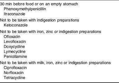 Many medicines have specific dosing recommendations with respect to food intake in order to optimise their absorption (Table 1). For example, tetracycline should not be taken with milk as this can significantly reduce the absorption; even the small amounts added to tea or coffee can have a clinically important effect(Reference Jung, Peregrina and Rodriguez6). For this reason, many patients alter their usual food intake to comply with dosing guidelines and may reduce their overall intake.