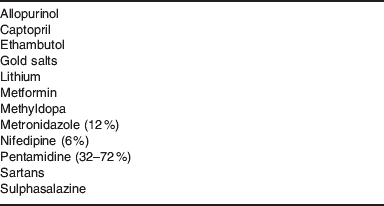 Taste disturbances can be categorised into four main types. Ageusia, a complete loss of one of the taste sensations, is rarely associated with drug therapy; however, hypogeusia, a reduction in the overall sense of taste, is more commonly associated with drug therapy (Table 8). Dysgeusia is an altered perception of taste, often described as bitter or metallic and is commonly associated with drug therapy (Tables 9 and 10). Parageusia is a bad taste in the mouth, in the absence of a source of taste and is rarely associated with drug therapy.