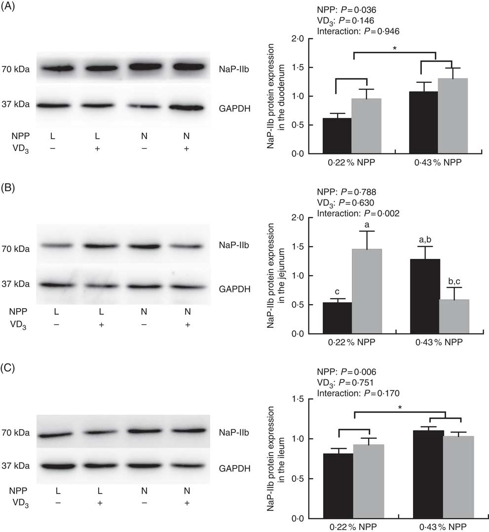 Fig. 1 Effects of dietary non-phytate phosphorus (NPP) and supplemental vitamin D3 (VD3) levels on type IIb sodium-dependent phosphate cotransporter (NaP-IIb) protein levels in small intestinal segments of broilers at 21 d of age. (A) The protein concentrations of NaP-IIb in the duodenum. (B) The protein concentrations of NaP-IIb in the jejunum. (C) The protein concentrations of NaP-IIb in the ileum. Glyceraldehyde-3-phosphate dehydrogenase (GAPDH) was used as a loading control. Values are mean (n 8), with their standard errors represented by vertical bars. a,b,c Based on the two-way ANOVA analyses, mean values with unlike letters were significantly different at P<0·05 between single bars (n 8) as determined by their interaction. * Mean values were significantly different at P<0·05 between group bars (n 16) as determined by a main effect of dietary NPP levels. L, low level of NPP (0·22 %); N, normal level of NPP (0·43 %). –, No addition of VD3; +, dietary supplemental 87·5 μg VD3/kg.