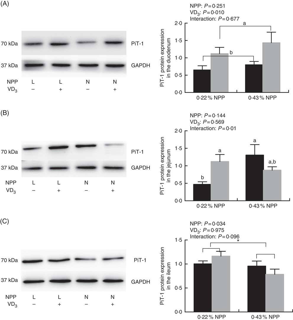 Fig. 2 Effects of dietary non-phytate phosphorus (NPP) and supplemental vitamin D3 (VD3) levels on type III sodium-dependent phosphate cotransporter 1 (PiT-1) protein levels in small intestinal segments of broilers at 21 d of age. (A) The protein concentrations of PiT-1 in the duodenum. (B) The protein concentrations of PiT-1 in the jejunum. (C) The protein concentrations of PiT-1 in the ileum. Glyceraldehyde-3-phosphate dehydrogenase (GAPDH) was used as a loading control. Values are mean (n 8), with their standard errors represented by vertical bars. a,b Based on the two-way ANOVA analyses, mean values with unlike letters were significantly different at P<0·05 between single bars (n 8) as determined by their interaction or between group bars (n 16) as determined by a main effect of supplemental VD3 levels. * Mean values were significantly different at P≤0·05 between group bars (n 16) as determined by a main effect of dietary NPP levels. L, low level of NPP (0·22 %); N, normal level of NPP (0·43 %). –, No addition of VD3; +, dietary supplemental 87·5 μg VD3/kg.