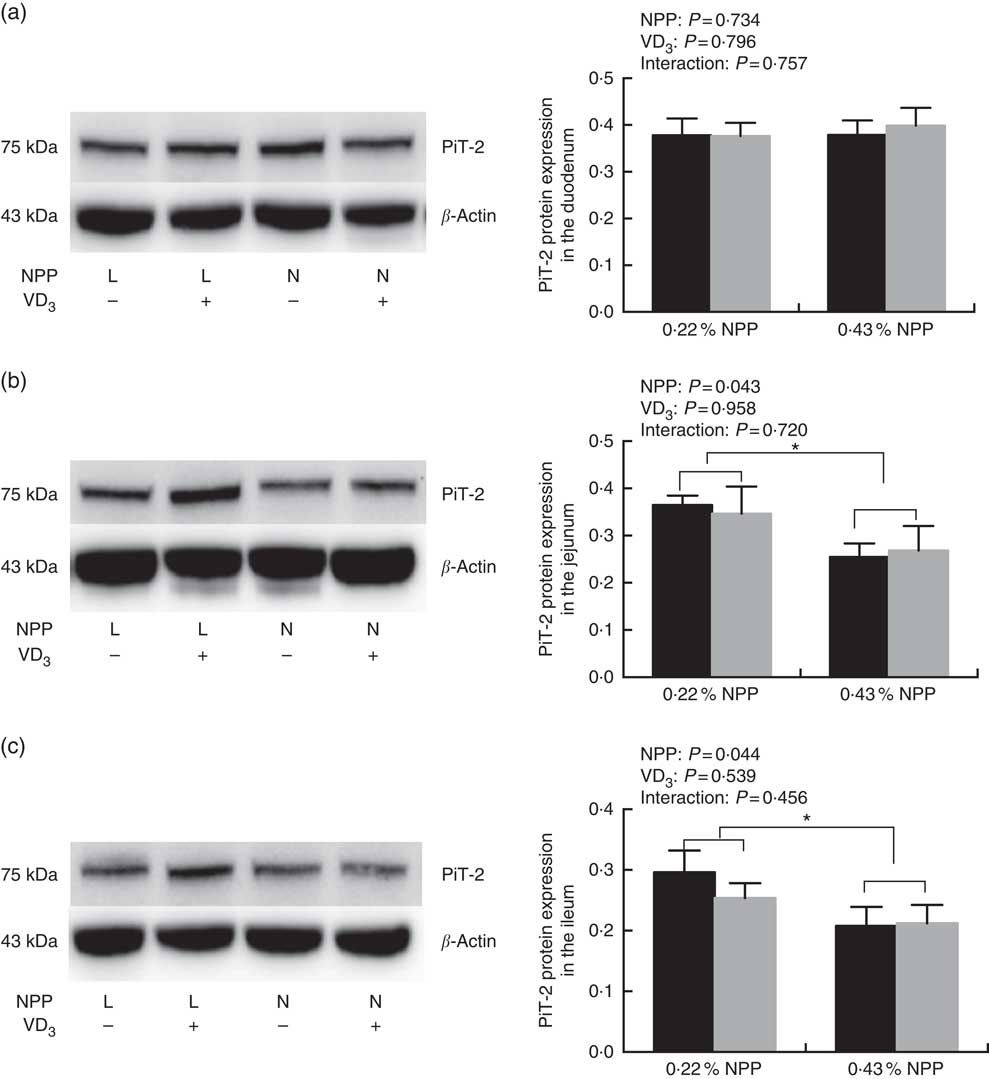 Dietary NPP level affected (P<0·05) the PiT-2 protein expressions in the jejunum and ileum (Fig. 3(b) and (c)), but had no effect (P=0·734) on the PiT-2 protein expression in the duodenum of broilers at 21 d of age (Fig. 3(a)). Dietary supplemental VD3 level did not affect (P>0·45) the PiT-2 protein expressions in all small intestinal segments (Fig. 3(a)–(c)). No interactions (P>0·45) were observed between NPP level and VD3 level for the PiT-2 protein expression in all small intestinal segments. Compared to diets with the 0·22 % NPP level, the 0·43 % NPP level decreased (P<0·05) the PiT-2 protein expression in the jejunum and ileum (Fig. 3(b) and (c)).