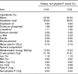 As a necessary mineral element for human and animals, P has several essential functions in nutrient metabolism, bone mineralisation, nucleic acid synthesis and signal transduction( Reference Berndt and Kumar 1 ). P deficiency can cause a reduced feed intake and abnormal skeletal development as well as a retarded growth performance and high mortality in chickens( Reference Webster 2 , Reference Long, Lee and Rowland 3 ). To meet the requirements of fast-growing chicks, adequate dietary non-phytate P (NPP) were added to diets( 4 ). P excess to requirement is excreted in the urine, leading not only to the economic cost but also to the environmental P pollution( Reference Liu, Li and Lu 5 , Reference Liu, Xie and Lu 6 ).