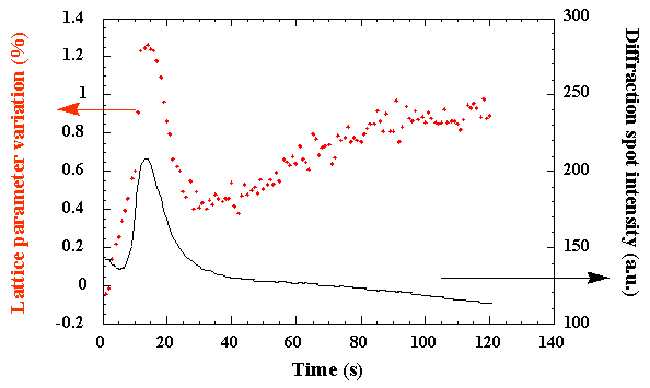 Figure 1 Variation, as a function of time, of the in-plane lattice parameter deduced from the spacing between the RHEED streaks (red dots) and of the 3D character of the growth, deduced from the intensity of a Bragg diffraction spot (black line). Growth rate is 0.25 ML /s.