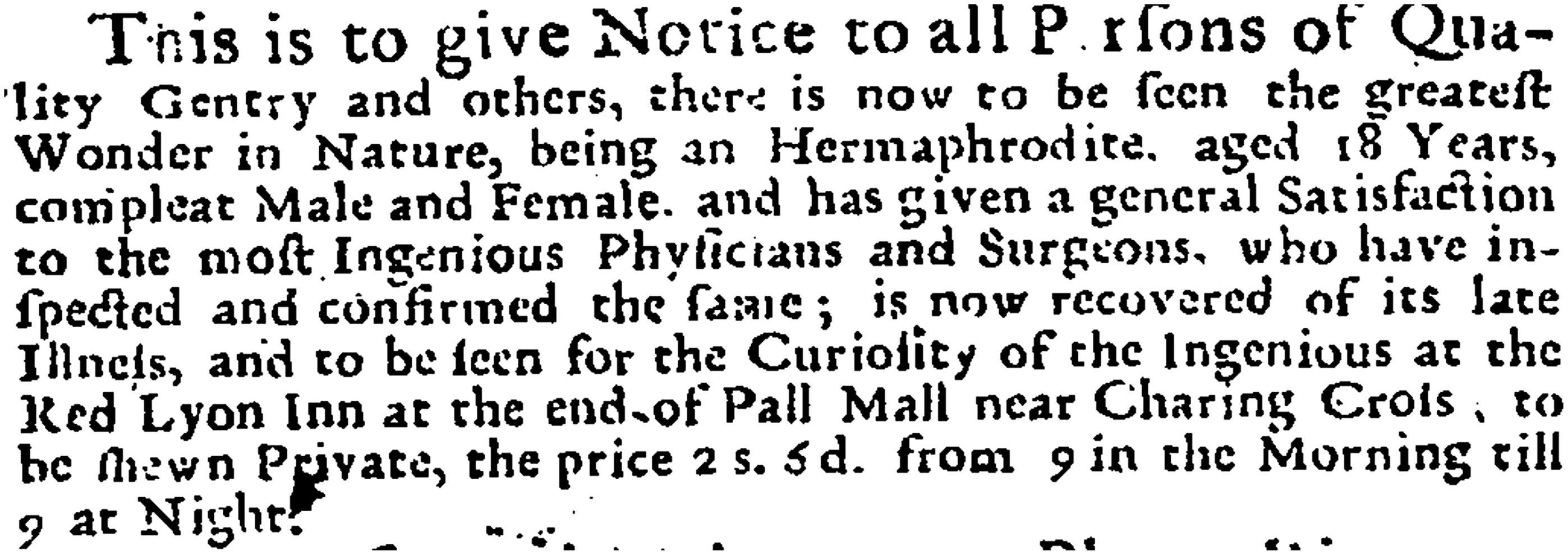 Douglas’s verdict that Boon—a validated, displayed hermaphrodite—was in fact or “really” a deformed woman and not a hermaphrodite was later repeated by other physicians with regard to other publicly displayed hermaphrodites.Footnote 22 According to Guerrini, public displays of hermaphrodites like Boon served as a space for the meeting of learned and popular curiosities. In these contexts, she says, physicians worked to create a hegemonic narrative of hermaphrodites by producing naturalistic descriptions, accompanied by illustrations and learned observations, that classified them to either sex (49). Despite these efforts, however, the capacity of such physicians to shape popular and even professional conceptions of hermaphrodites was limited, as the public and other professionals maintained the belief that true hermaphrodites can exist (50).