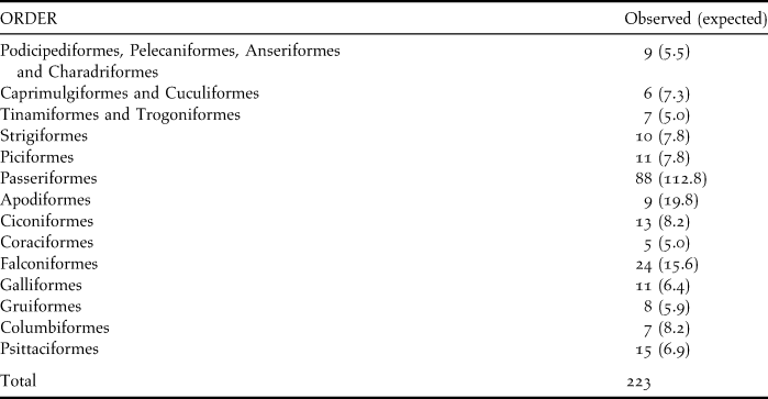 Table 1. Number of threatened bird species in Guatemala. Figures are the observed and expected number per taxonomic orders. Some taxa were grouped in order to attain the requirements of the χ2proof that does not permit expected numbers smaller than 5.
