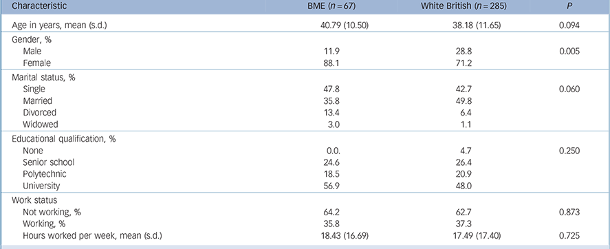 Participants were classified as being either White British (i.e. those who described themselves as ‘White British’ or ‘White English’) or BME, defined in this study as ‘a minority group or any group within any one country from which its cultural, racial, ethnic or national identity is different to the dominant identity (or to the one shared by the majority) in their country of residence’.Reference Dinos, Khoshaba, Ashby, White, Nazroo and Wessely3