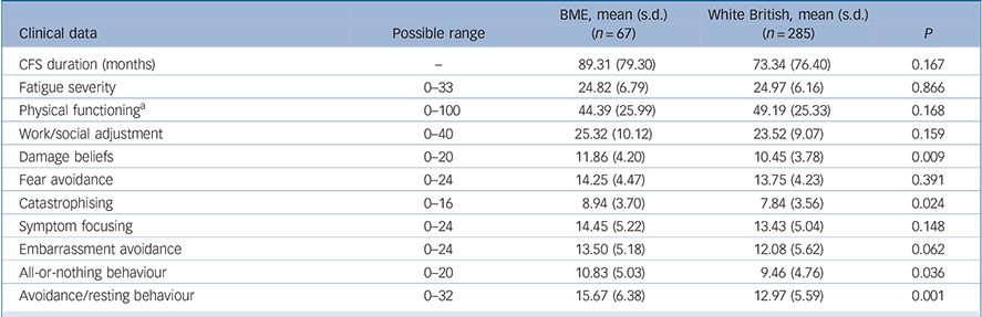 As Table 2 shows, BME participants reported significantly higher baseline damage beliefs (P = 0.009), catastrophising (P = 0.024), all-or-nothing behaviour (P = 0.036) and avoidance/resting behaviour (P = 0.001). There were no differences between groups in fatigue severity, physical functioning, work/social adjustment, fear avoidance, symptom focusing or embarrassment avoidance.