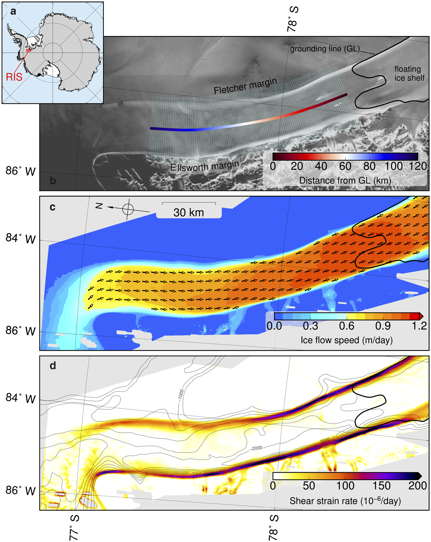 All of the mechanisms represented by the various enhancement factors in Eqn (2) can be influenced by bed topography because of their dependence on cumulative strain and strain rate. RIS flows through a well-defined subglacial trough (Fig. 1). As the ice flows, it is squeezed between highs in the bed topography on either side (Figs 1c and 2). Taking RIS width to be the cross-stream distance between maximum shear strain rates in each margin, we can see that RIS narrows by ~6 km (≈25% of the total width) in the downstream direction between 120 and 40 km upstream of the GL (UGL), where the GL is the boundary between grounded and floating ice. In the final 40 km UGL, RIS widens by ~3 km (Fig. 3b). Along the Ellsworth margin, the encroachment of the Ellsworth Mountains into the path of the flow causes the ice to be compressed against the mountains, leading to variations in both amplitude and cross-stream position of maximum shear strain rates (Figs 2b and 3a). In the Fletcher Margin, shear strain rates increase as the ice stream slowly widens and flow accelerates following the encroachment of the Fletcher Promontory at ~60 km UGL (Figs 1c and 2b). The result is a roughly monotonic increase in shear strain rates in the Fletcher margin for ~50 km (Fig. 3a).