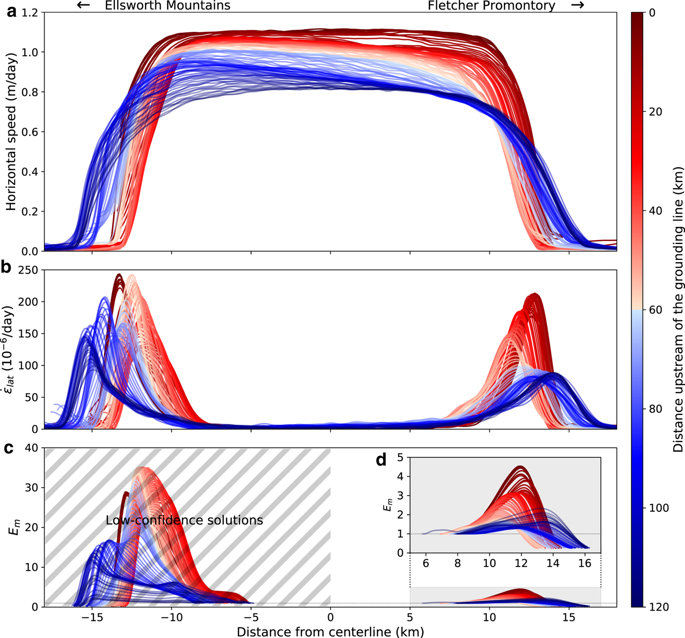 Fig. 2. Downstream variation in (a) observed horizontal surface speed, (b) lateral shear strain rate and (c, d) inferred values of E m ≡ E/E f along transects shown in Figure 1b. We have low confidence in the E m solutions in the Ellsworth margin (hatched region in panel c) because the local ice thickness is poorly constrained. Panel (d) shows a close-up view of E m in the Fletcher margin. We use the same color scheme for all panels and show it in map view in Figure 1b. In all panels, the ice flow direction is out of the page and from blue to red in the colormap. The Ellsworth Mountains are to the left and the Fletcher Promontory is to the right.
