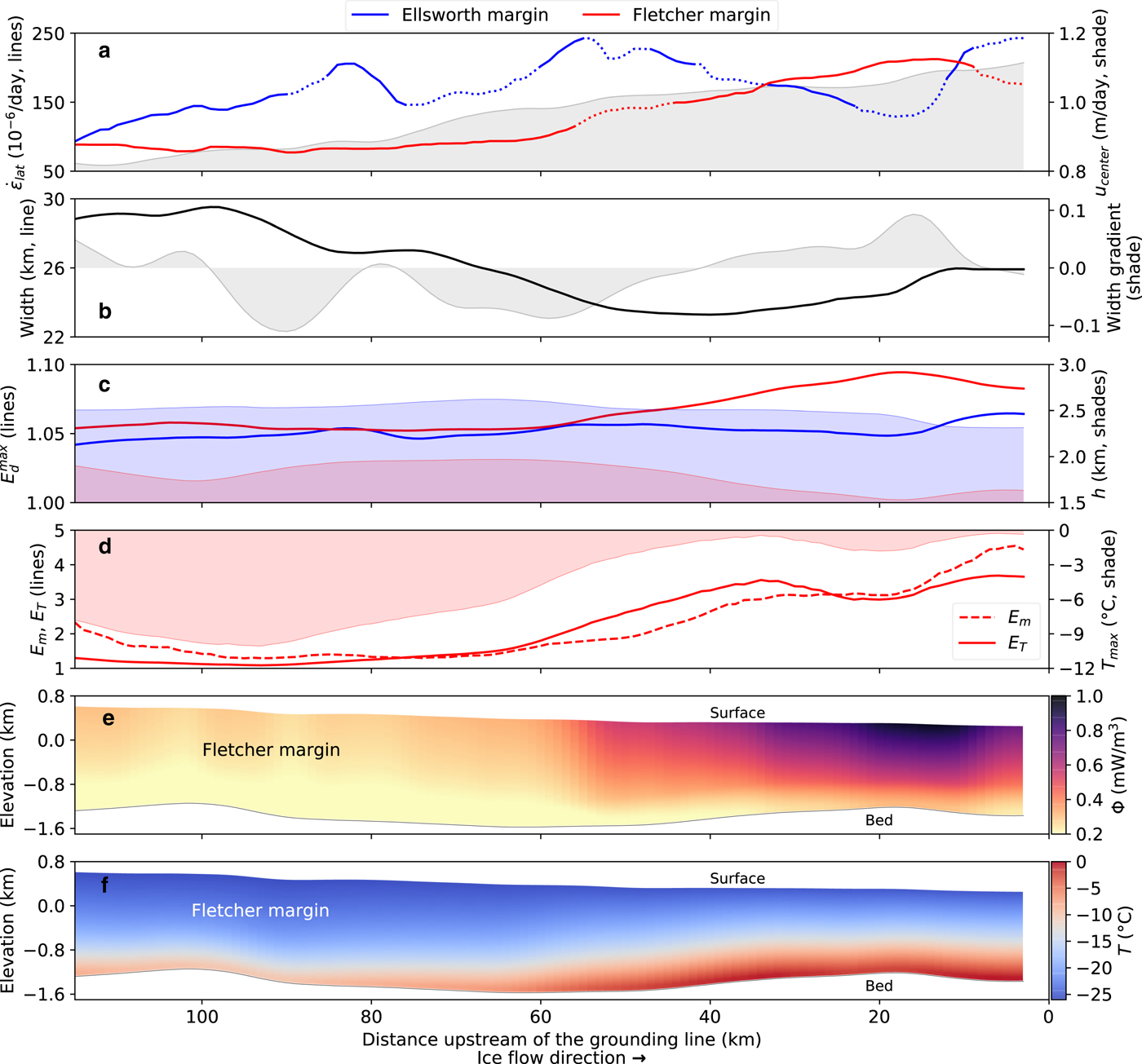 $E_{{\rm d}}^{{\rm max}}$ (lines) and ice thickness h in the margins (shaded regions). (d) Thermal, E T, (solid line) and margin, E m, (dashed line) enhancement factors overlaying inferred maximum (basal) ice temperature (shaded region). All values for E T and T are calculated using E fA * = 18 (see Table 1 for A * values). (e) Steady-state rates of shear heating, Φ, and (f) ice temperature with elevation defined relative to mean sea level. For reference, 1 mW/m3 ≈ 16.7 × 10−3 °C a−1, using values given in Table 1. We show only the Fletcher margin in (d–f) because ice thickness is poorly constrained in the Ellsworth margin.