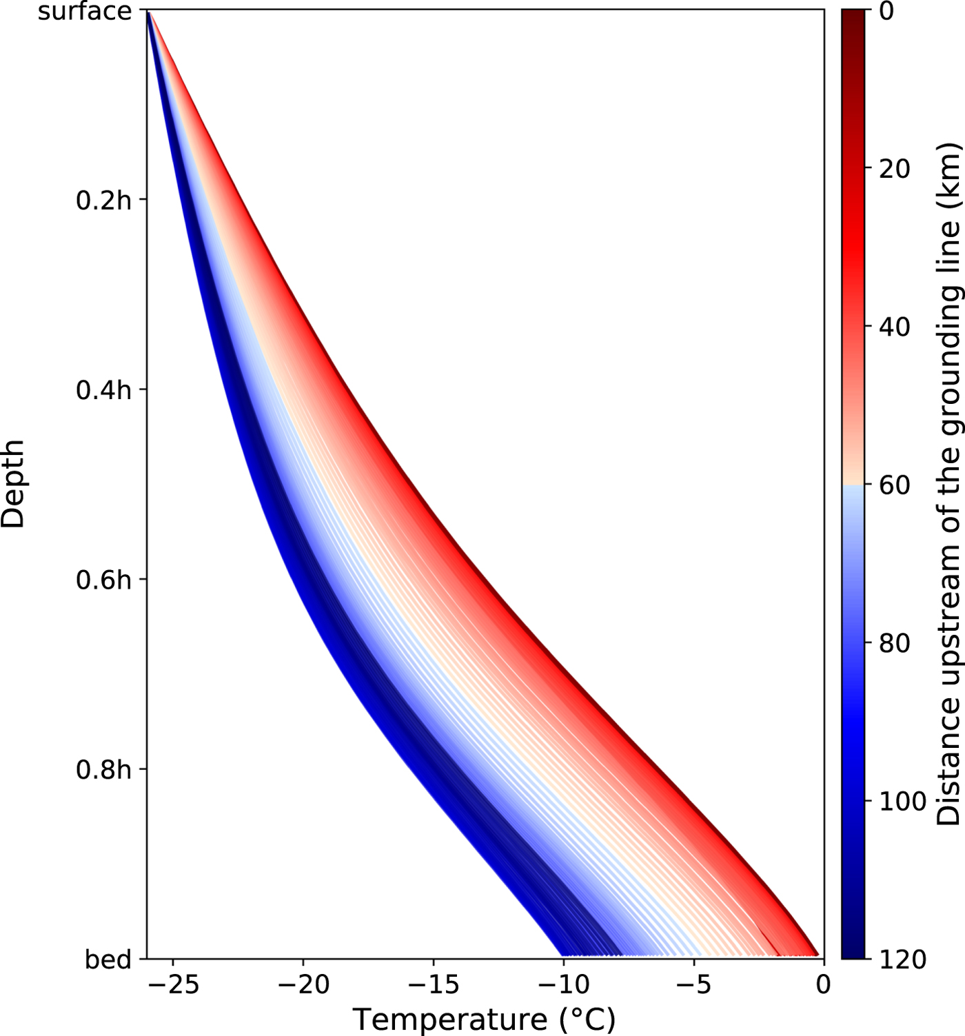 Fig. 4. Inferred vertical temperature profile in the Fletcher margin for transects shown in Fig. 1b. The vertical dimension is given as a function of ice thickness h, and the color scheme is the same as in Figs 1b and 2. Maximum values correspond to values shown in Fig. 3d and the profiles are the same as in Fig. 3e. The surface temperature is set to the mean annual atmospheric temperature of −26°C (Doake and others, Reference Doake, Alley and Bindschadler2001).