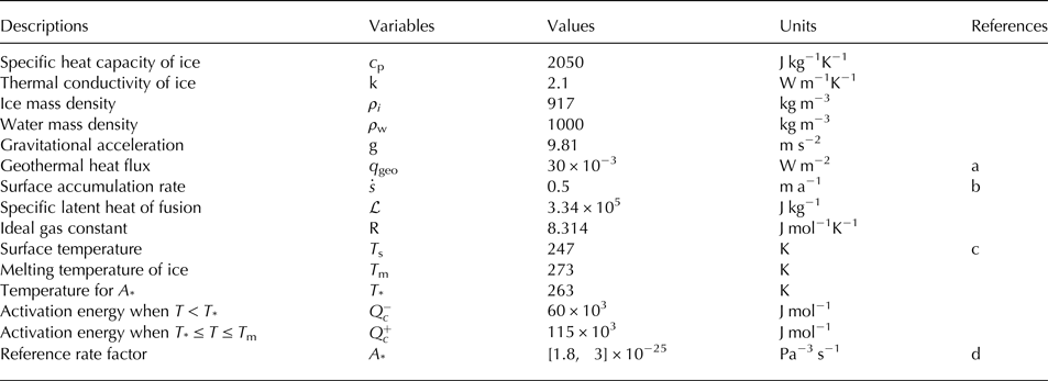 Table 1. Model parameters. Unless otherwise stated, values are from (Cuffey and Paterson, Reference Cuffey and Paterson2010)