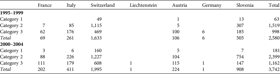 Table 1 Number of lynx Lynx lynx signs collected in each alpine country, by Category (see text for further details) and for 1995–1999 and 2000–2004.