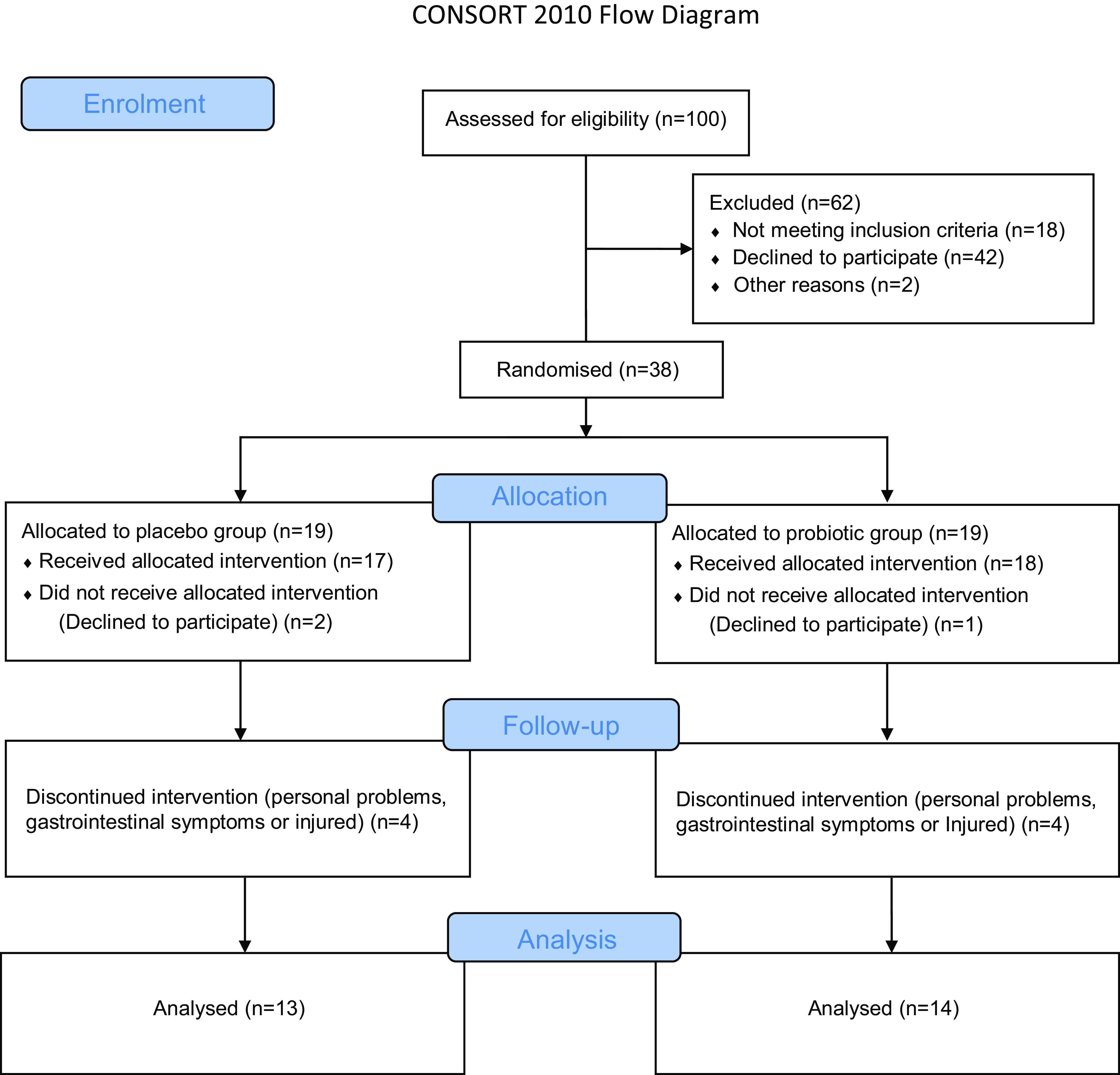 An online screening (via email) was performed to verify the inclusion and exclusion criteria of the study. The inclusion criteria were as follows: age between 25–45 years, history of at least one marathon race and at least 2 years of training. The exclusion criteria were as follows: consumption of alcoholic beverages more than twice a week; smokers; diagnosis of cardiovascular, pulmonary or metabolic disease; use of probiotics or consumption of foods enriched with probiotics; and use of drugs that could interfere with the results of the study, such as anti-inflammatories and antibiotics in the last 6 months. Finally, the sample consisted of twenty-seven male marathon runners divided into two distinct groups: placebo (PLA, n 13) and probiotic (PRO, n 14). The anthropometric characterisation of the runners was previously described(Reference Batatinha, Tavares-Silva and Leite17). Based on a study that assessed the alteration in IL-6 production by monocytes following probiotic supplementation (or placebo) in conjunction with a marathon, we conducted a sample calculation for the repeated-measures ANOVA test (2 groups × 5 time points) using the G*Power software. The significance level (alpha) was set at < 0·05 and the statistical power at > 0·80. The effect size calculated for internal factors was 0·47, and for between groups, it was 0·62. The correlation between repeated measurements was found to be 0·25. Consequently, it was recommended that a total of ten volunteers (five in each group) would be adequate to detect pre- and post-supplementation differences. Additionally, twelve volunteers in total (six in each group) were suggested to identify distinctions between the groups. Considering the experimental design’s nature and the potential for volunteer discrepancies, we initiated the study with a larger sample size, concluding with thirteen volunteers in the PLA group and fourteen in the PRO group. The sample size calculation drew inspiration from the study conducted by Tavares-Silva et al (Reference Tavares-Silva, Caris and Santos16).
