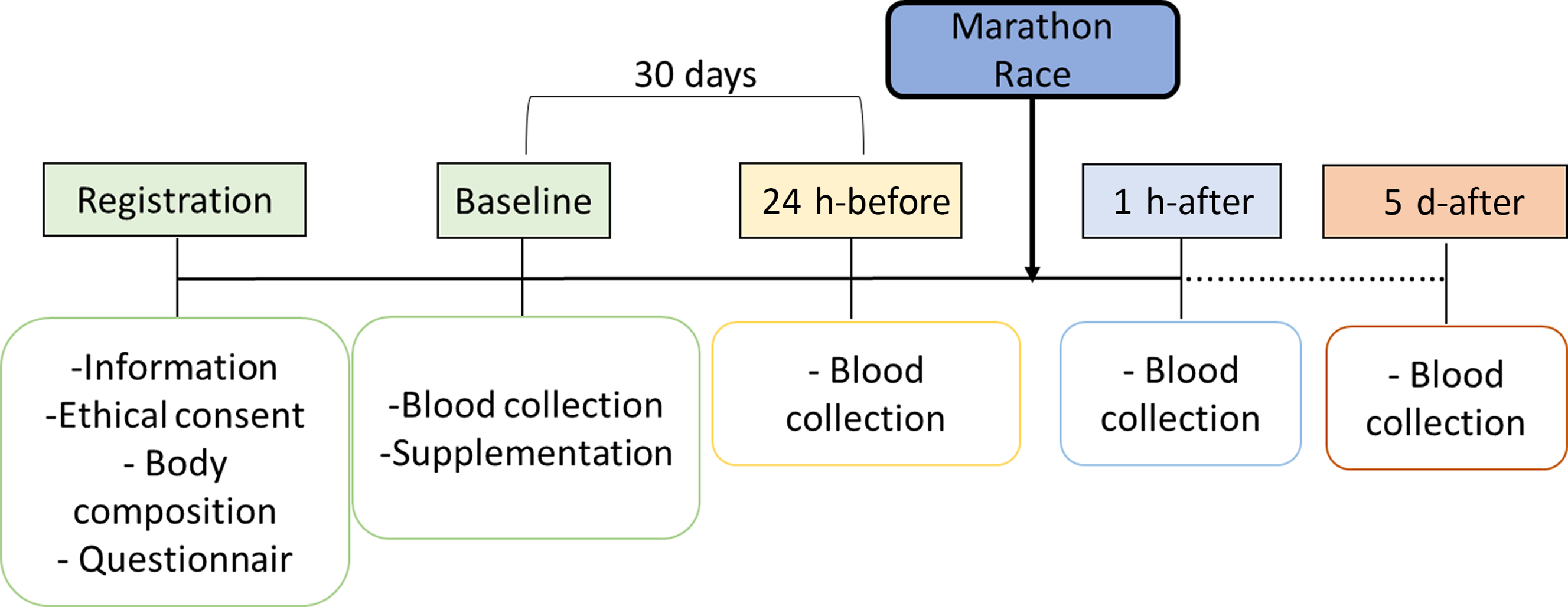 This is a randomised, controlled and double-blind study (Fig. 1). As shown in Fig. 2, athletes were first attended to the laboratory for registration, which included a body composition analysis (BOD POD® body composition system; Life Measurement Instruments, Concord, CA, USA). Whether eligible for the study, athletes were allocated to their respective groups. Then, at baseline, it was collected a peripheral blood sample and provided supplements (probiotics or placebo). After 30 d of supplementation, athletes returned to the laboratory, and a new blood sample was collected 24 h before the competition (24 h-before). The supplementation was stopped at this time. On the day of the official marathon (42·195 m), a blood sample was collected 1 h after the end of the race (1 h-after). Another blood sample was collected 5 d after the marathon race (5 d-after).