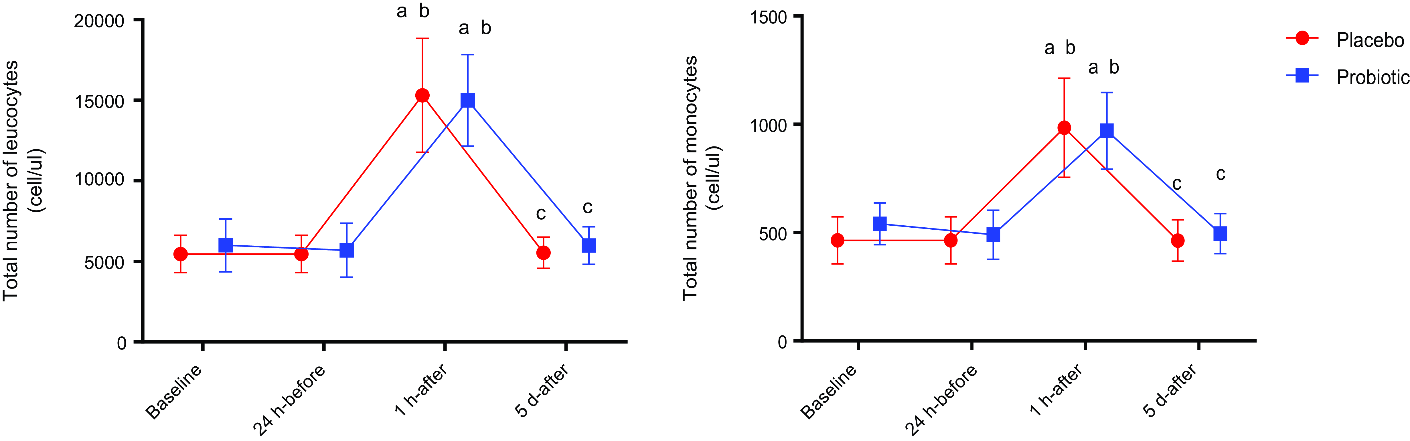 Fig. 3. Total number of leucocytes and monocytes. Data presented in mean ± sd. Placebo (n 13) and probiotic (n 14). The comparison between groups and moments was performed through the general linear model with post hoc Tukey. ‘a’ differs from the baseline condition of the same group. ‘b’ differs from the 24 h-before of the same group. ‘c’ different from 1 h-after of the same group.
