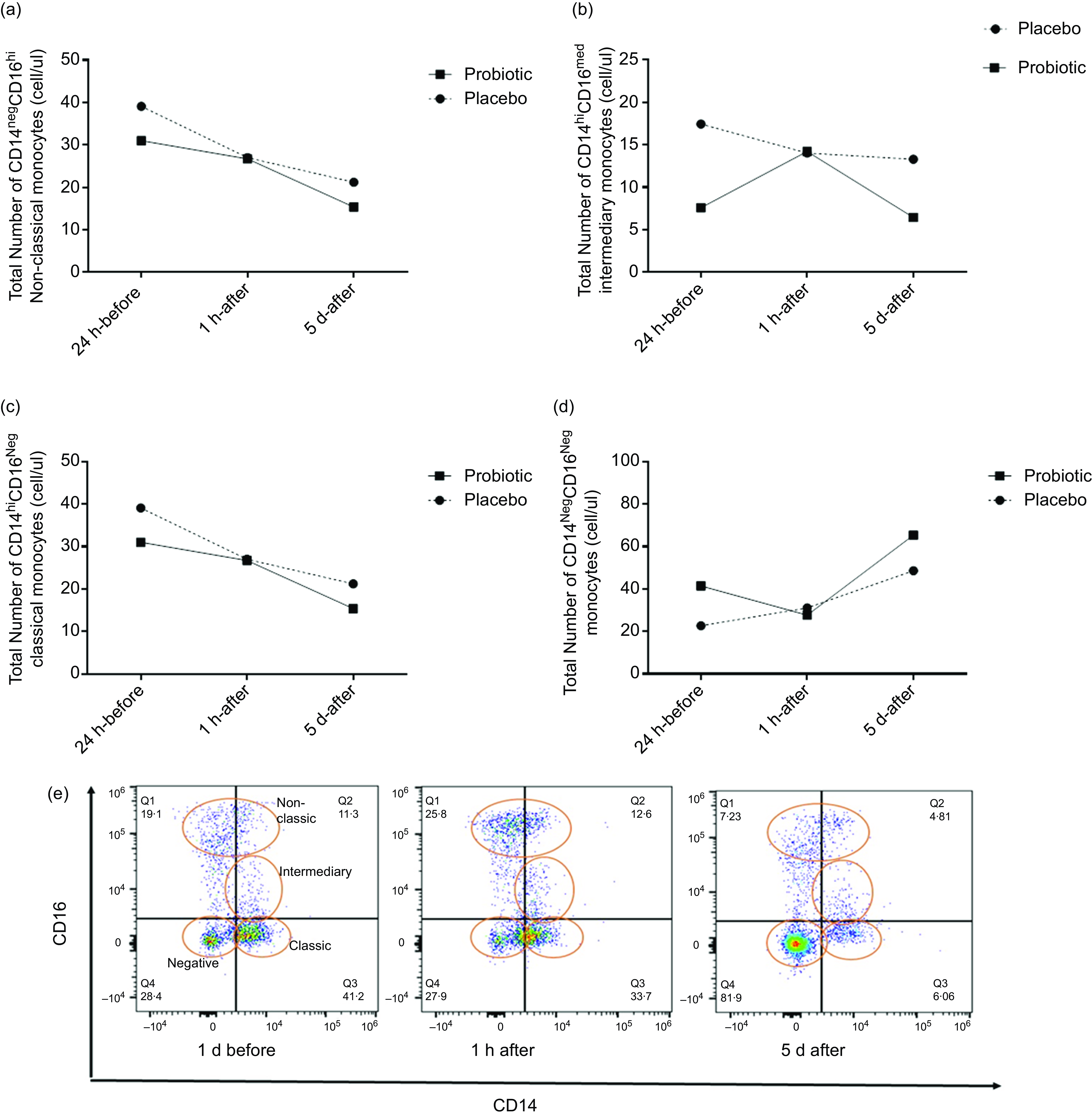 Fig. 4. Immunophenotyping. Data presented as mean ± sd. Significance P < 0·05. The absolute amount of non-classical monocytes CD14pos CD16pos (graph (a)), intermediate CD14pos CD14med (graph (b)), classic CD14pos CD16neg (graph (c)) and double negative CD14pos CD16neg (graph (d)) of both groups; in the pre-test, post-test and recovery moments. Graph (e) refers to the representation of the monocyte population from flow cytometry. Positive y-axis CD16 and positive x-axis CD14. A total of eight participants (placebo 4 and probiotic 4).