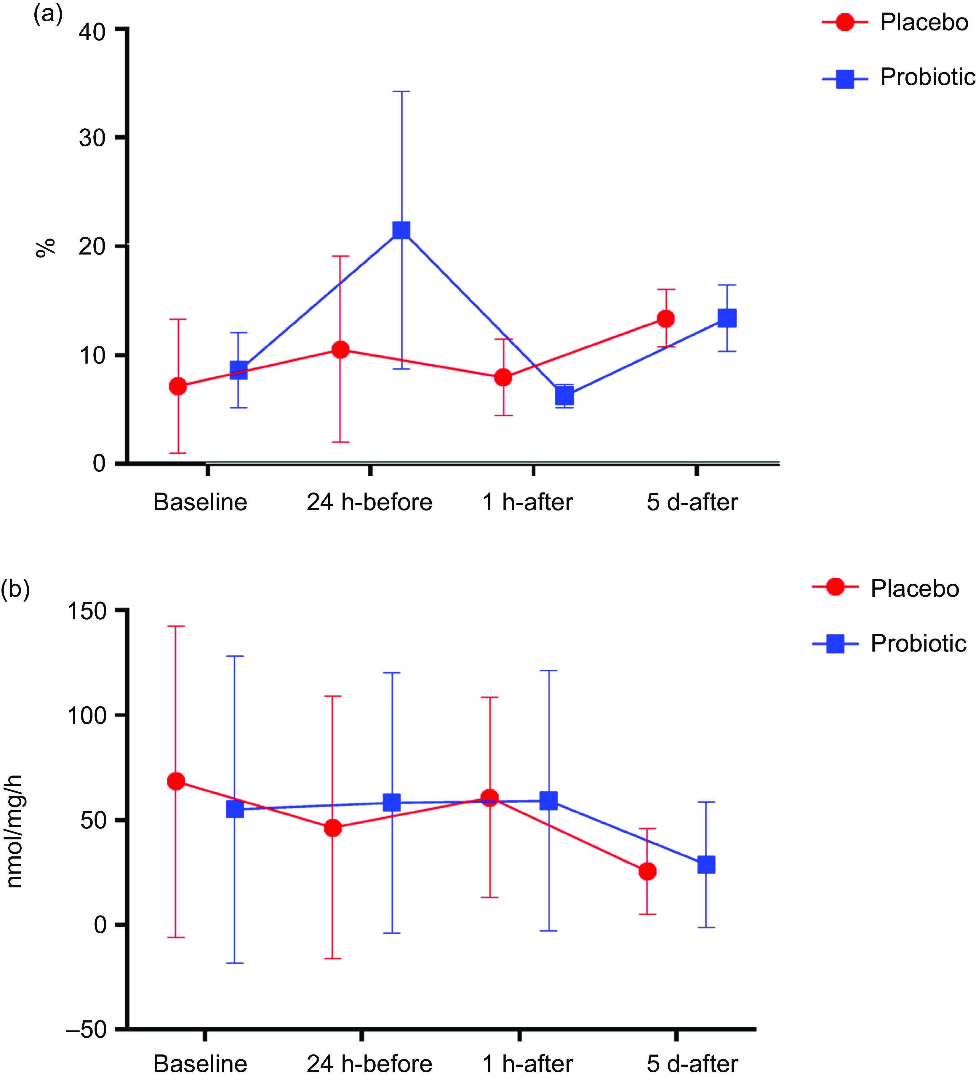 Regarding cell function, the PRO group showed an increase in phagocytosis 24 h-before compared with baseline (P < 0·01), followed by a decrease 1 h-after compared with 24 h-before (P = 0·03). At the 5 d-after, there was a significant increase compared with the 1 h-after (P < 0·01). In the PLA group, only an increase was observed in 5 d-after compared with 1 h-after (P = 0·03) (Fig. 5(a)). The H2O2 concentration did not differ significantly at any evaluated time point (Fig. 5(b)).