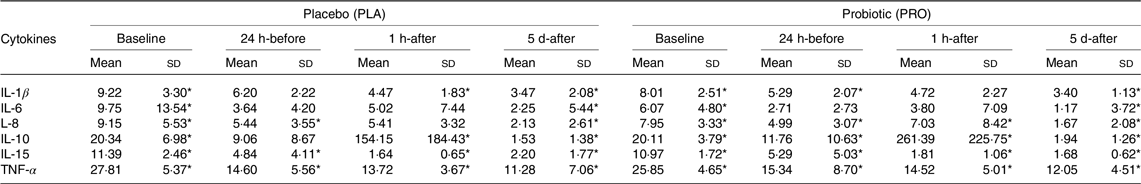 The serum concentration of IL-1β in the PRO group differed in 24-before (P < 0·01), 1 h-after (P < 0·01) and 5 d-after (P < 0·001) compared with baseline, whereas the PLA group showed a decrease at 1 h-after (P < 0·001) and 5 d-after (P < 0·001) compared with baseline and 5 d-after compared with 1 h-after (P = 0·03). IL-6 levels were lower 5 d-after compared with baseline in both PRO (P = 0·04) and PLA groups (P = 0·03). A significant reduction in IL-8 concentrations was observed 5 d-after in the PRO group compared with baseline (P < 0·001), 24 h-before (P < 0·01) and 1 h-after (P < 0·04). PLA group showed a decrease in 5 d-after compared with baseline (P < 0·001) and 24 h-before (P < 0·01). The anti-inflammatory cytokine, IL-10, from samples of the PRO group, showed an increase 1 h-after compared with baseline (P < 0·01) and 24 h-before (P < 0·01) and reduced 5 d-after compared with baseline (P < 0·001), 24 h-before (P < 0·02) and 1 h-after (P < 0·01). In the PLA group, this cytokine increased 1 h-after (P < 0·02) and reduced 5 d-after compared with 1 h-after (P < 0·02) and baseline (P < 0·001). Finally, both IL-15 and TNF-α decreased at 24 h-before (P < 0·01), 1 h-after (P < 0·001) and 5 d-after (P < 0·001) times compared with baseline on both groups (Table 2).