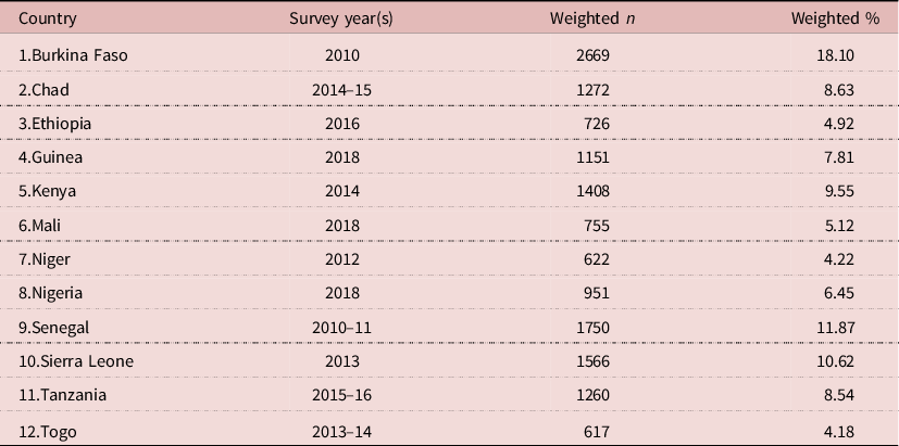 The study pooled DHS data from twelve sub-Saharan Africa countries covering the period from January 2010 to December 2018. The inclusion criteria in the selection of countries was that they had a recent DHS survey (2010–2018) with data on girl-child marriage and FGM. The women’s file (IR) which gathers data from women aged 15–49 years on significant indicators related to children’s and women’s health, including girl-child marriage and FGM was used (Corsi et al., Reference Corsi, Neuman, Finlay and Subramanian2012). The DHS uses a stratified sampling approach, which is done in two stages from a nationally representative sample. Details of the sampling process has been provided in a previous study (Aliaga & Ruilin, Reference Aliaga and Ruilin2006). This study included a total of 14,748 women aged 20–24 years for whom there was complete information on the essential variables. Table 1 shows the weighted samples for each country.