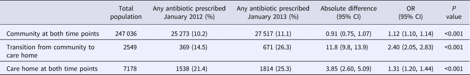 This study has shown that the odds of being prescribed at least one antibiotic are at least twice as high in care homes as they are in the community, accounting for co-morbidities. While this may be expected, given the frailty of the care home population, we believe that this is not solely due to a continuation of antibiotic prescribing to sick individuals admitted from the community. This is evidenced by the change in the percentage prescribed an antibiotic on admission to the care home and the continued high percentage that receive an antibiotic after admission. We also found that the odds of being prescribed antibiotics were 50% higher in females, compared with males which is consistent with a recent systematic review and meta-analysis in the community setting [Reference Schröder17]. We hypothesise that this may arise for a number of reasons including differences in urinary tract infection prevalence in men and women, as well as differences in health seeking behaviour, with females residing in the community more likely to consult their GP [Reference Smith18].