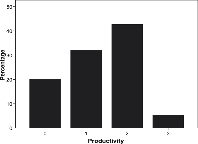 Figure 2. Productivity (number of fledglings per breeding attempt, n = 75) of Lear’s Macaws in 2009–2010. Raw data are depicted as the percentage of cases with 0–3 fledglings.