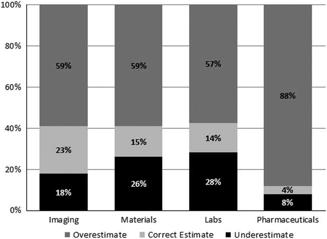 Figure 1 provides an overview of the percentage of correct estimates, overestimates, and underestimates for each of the four categories. The percentage of correct cost estimates among ED physicians did not exceed 25% in any of the four categories. The pharmaceuticals category was the most overestimated at 88% and was also the least accurate, with 4% accurately estimated costs.