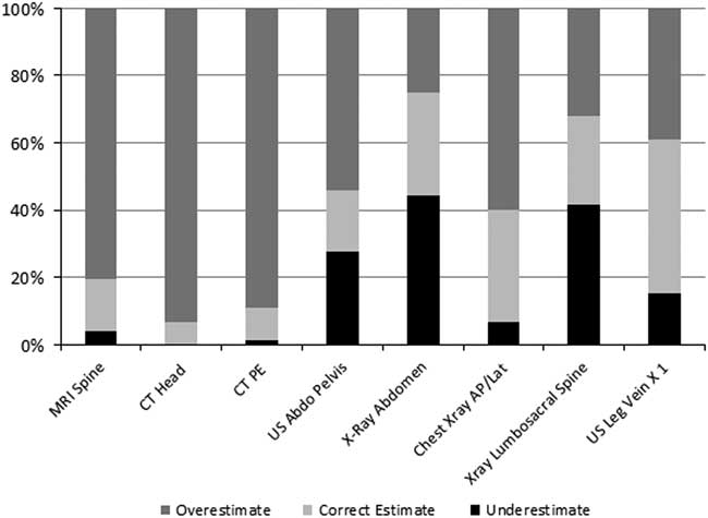 Figure 2 Percentages of ED physician under-, correct, and overestimates for cost of various imaging investigations.