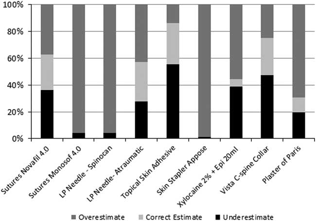 Figure 3 shows a breakdown of correct estimates, overestimates, and underestimates for each item in the materials category. Of note, 56% underestimated the cost of topical skin adhesive, while over 47% underestimated the cost of cervical spine collars.