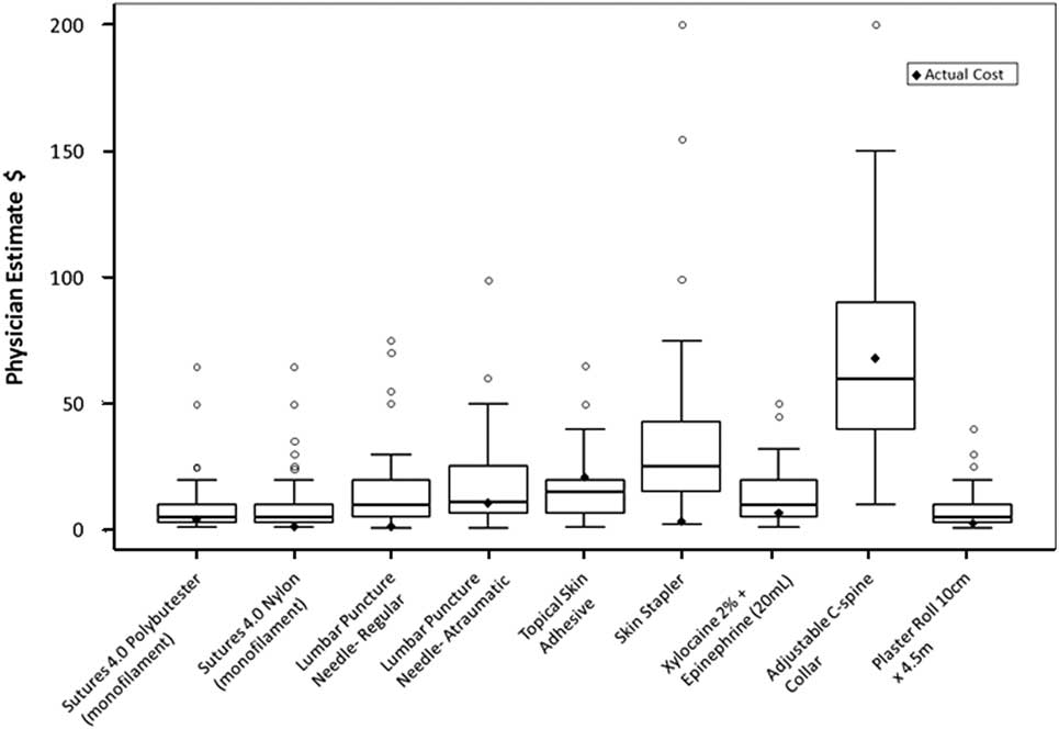 A total of 41 items across each of the four categories (imaging investigations, materials, laboratory tests, and pharmaceuticals) were selected for the survey based on high frequency of use, availability of cost-effective alternatives, and tests considered to be “low-yield.” The survey was created using Survey Monkey’s online platform and distributed via email to ED staff physicians and resident physicians by the chief of the department. Three reminder emails were sent over a two-month period. Participants were asked to estimate the cost of the 41 items and input their estimates using “free-text” fields that allow entry of values precise to the cent. An explanation of “total direct costs” was provided for each category. Participants were asked not to include indirect costs or physician billings. The survey could be exited at any time, but questions could not be skipped, and the data were only collected once participants submitted a fully completed survey.