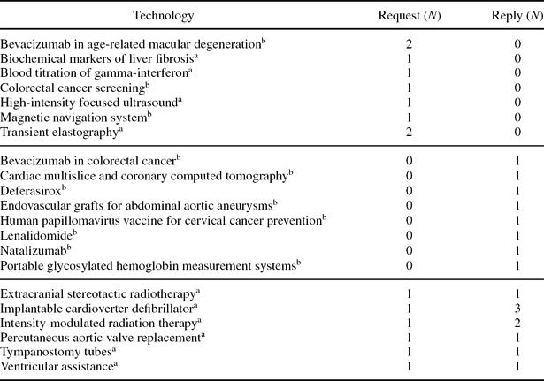 The participating partners tested the forms for twenty-one technologies (Table 1). Information was requested on thirteen technologies; only six of thirteen requests received a reply. Information on eight technologies was provided spontaneously. More than one request or reply was recorded for four technologies (bevacizumab in age-related macular degeneration, transient elastography, implantable cardioverter defibrillator, intensity-modulated radiation therapy [IMRT]).