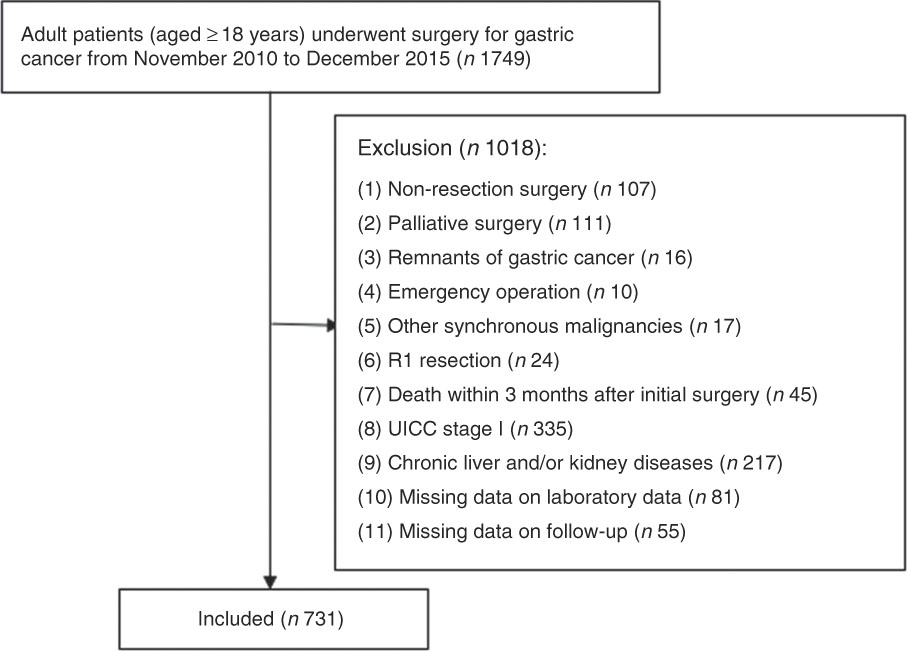 A total of 1749 consecutive patients undergoing operations for pathologically confirmed gastric adenocarcinoma between November 2010 and December 2015 in our hospital were reviewed. Exclusion criteria and the flow chart of the study are shown in Fig. 1. Chronic liver disease was diagnosed in patients with chronic viral hepatitis or cirrhosis, and kidney disease was delimited by an estimated glomerular filtration rate <60 ml/min per 1·73 m2 ( Reference Sakurai, Tamura and Toyokawa 21 ). The present study was conducted according to the guidelines laid down in the Declaration of Helsinki, and was approved by the ethics committee of the Affiliated Cancer Hospital of Xiangya School of Medicine, Central South University. Written informed consents were obtained from all participants.