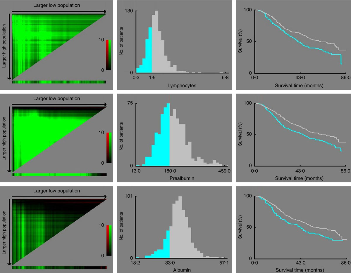 Fig. 2 X-tile analyses of overall survival performed using patients’ data to determine the optimal cut-off values for the lymphocyte count, serum prealbumin and albumin concentrations. In the left panels, the X-axis represents all potential cut-off values from low to high (left to right) that define a low subset, whereas the Y-axis represents the cut-off values from high to low (top to bottom) that define a high subset. Red coloration of a cut-off value indicates an inverse correlation with time to recurrence, and the green coloration represents direct associations. The optimal cut-off values highlighted by the black circles in the left panels are shown in the histograms of the entire cohort (middle panels). Kaplan–Meier plots are displayed in the right panels, where blue represents the low subgroup and grey represents the high subgroup. The optimal cut-off values for the lymphocyte count, serum prealbumin and albumin concentrations are 1·5×109/litre, 180 mg/l and 33 g/l, respectively.