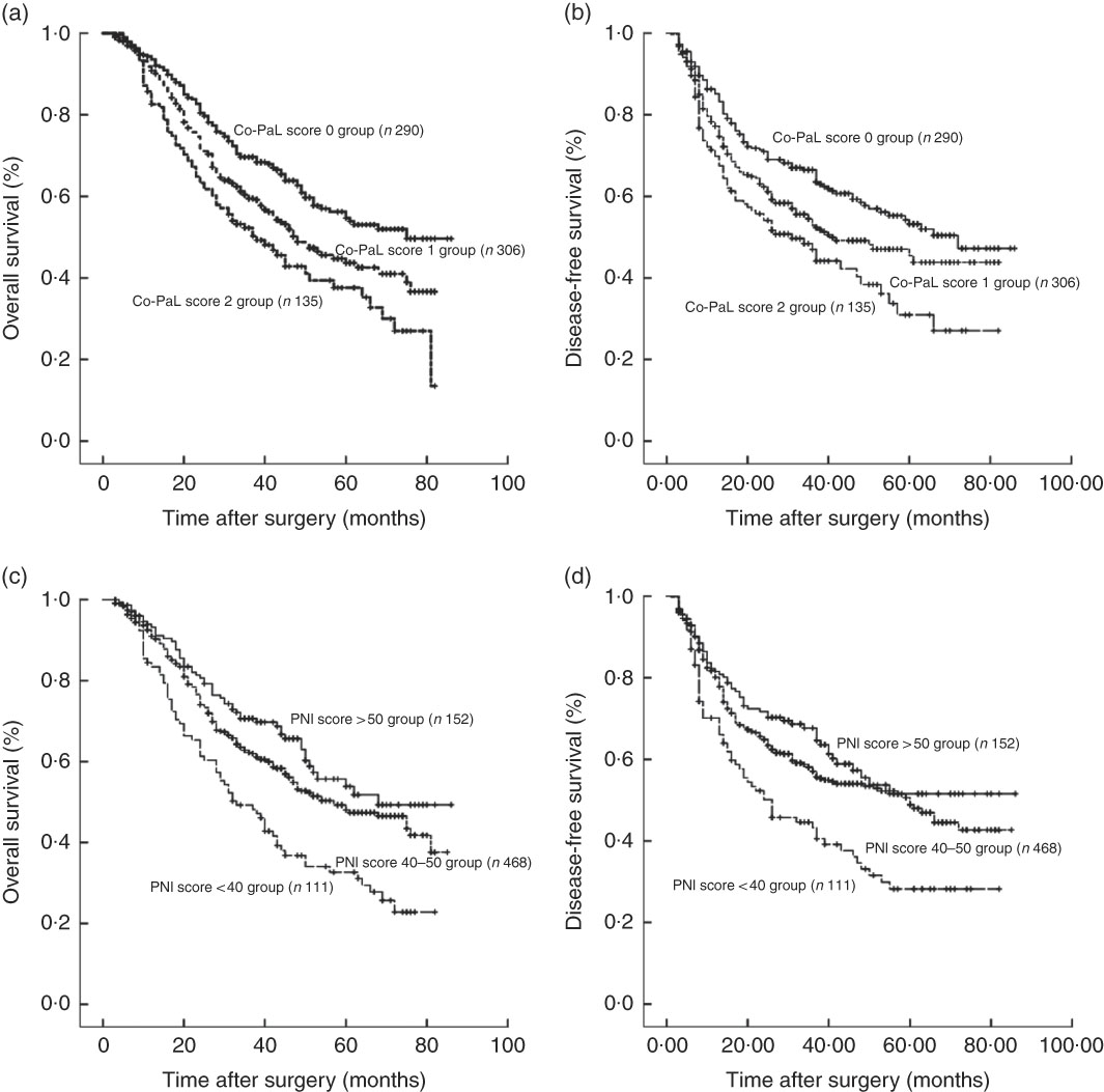 Fig. 3 Overall and disease-free survival curves in 731 patients who underwent gastrectomy for stage II/III gastric cancer. (a) Overall survival classified by a combination of the prealbumin concentration and lymphocyte count (Co-PaL) score. Co-PaL score 0 group v. 1 group, P=0·005; Co-PaL score 0 group v. 2 group, P<0·001; Co-PaL score 1 group v. 2 group, P=0·039. (b) Disease-free survival classified by the Co-PaL score. Co-PaL score 0 group v. 1 group, P=0·018; Co-PaL score 0 group v. 2 group, P<0·001; Co-PaL score 1 group v. 2 group, P=0·048. (c) Overall survival classified by the prognostic nutritional index (PNI). PNI score >50 group v. 40–50 group, P=0·107; PNI score >50 group v. <40 group, P<0·001; PNI score 40–50 group v. <40 group, P<0·001. (d) Disease-free survival classified by the PNI. PNI score >50 group v. 40–50 group, P=0·193; PNI score >50 group v. <40 group, P<0·001; PNI score 40–50 group v. <40 group, P=0·001.