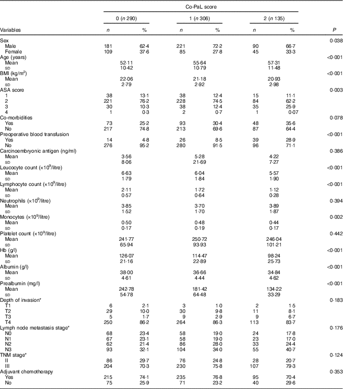 The Co-PaL score was 0 for 290 patients (39·7 %), 1 for 306 patients (41·9 %) and 2 for 135 patients (18·5 %), respectively. As shown in Table 1, patients with a greater Co-PaL score seemed to be older, with a smaller BMI, a greater American Society of Anesthesiologist score, lower Hb, albumin and prealbumin concentrations, more commonly needed a preoperative blood transfusion and had lower leucocyte, monocyte and lymphocyte counts. Although there was a tendency towards a higher rate of lymph node metastasis and stage III diseases in patients with greater Co-PaL scores, the difference did not reach a statistically significant level (all P>0·05).