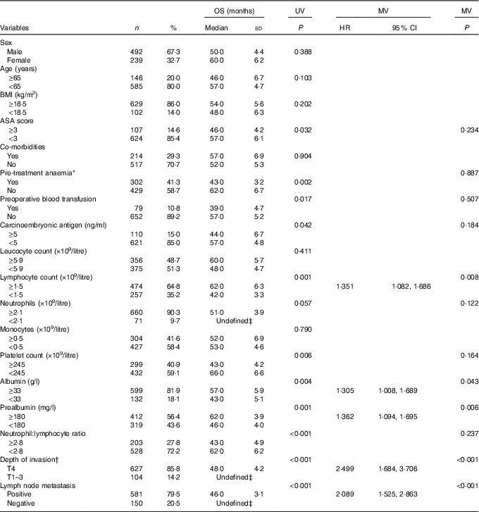 On the basis of univariate analysis and further multivariate Cox regression analysis to adjust for potential confounders (factors with a P-values ≤0·1 in univariate analysis), the following factors were clarified as negative independent prognosticators for OS: lymphocyte count <1·5×109/litre (hazard ratio (HR): 1·351, 95 % CI 1·082, 1·686, P=0·008), albumin <33 g/l (HR: 1·305, 95 % CI 1·008, 1·689, P=0·043), prealbumin <180 mg/l (HR: 1·362, 95 % CI 1·094, 1·695, P=0·006), serous invasion (T4) (HR: 2·499, 95 % CI 1·684, 3·706, P<0·001) and lymph node metastasis (HR: 2·089, 95 % CI 1·525, 2·863, P<0·001). No other variable such as being older, pretreatment anaemia or blood transfusion was identified as an independent predictor for a reduction of OS (Table 2).