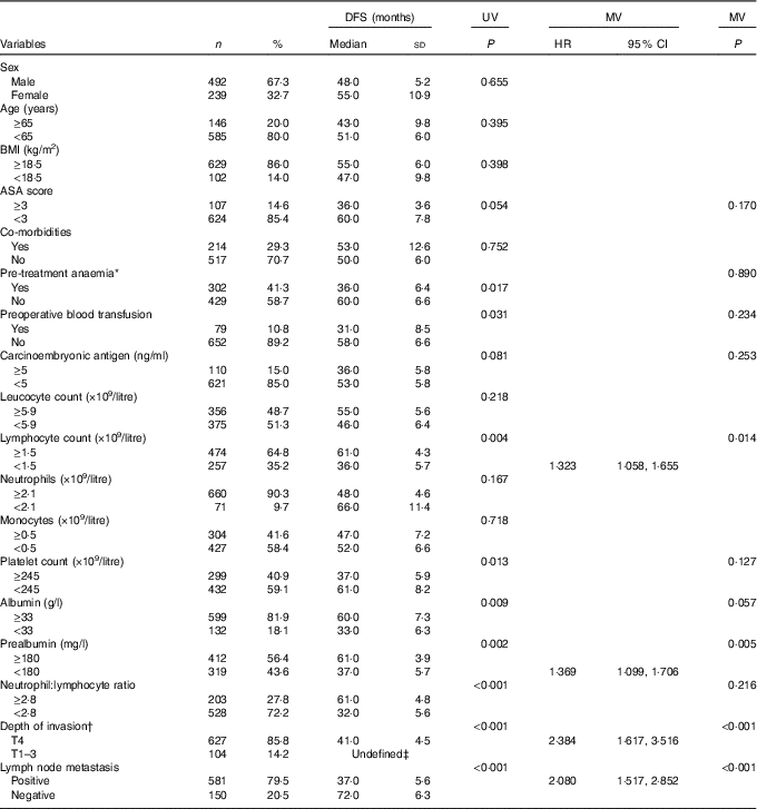 Table 3 Univariate analysis (UV) and multivariate analysis (MV) of prognostic factors for disease-free survival (DFS) after radical resection of stage II/III gastric cancer (n 731) (Numbers and percentages; medians and standard deviations; hazard ratios (HR) and 95 % confidence intervals)