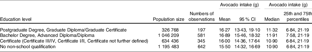 Table 2. Mean (95 % confidence interval) and median (25th and 75th percentiles) avocado consumption by education level, for ‘avocado consumers’ only, 2011–2012 National Nutrition and Physical Activity Survey (NNPAS)*,†